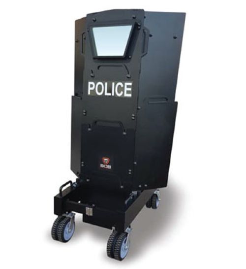 Los cuatro paneles laterales o «alas» se pueden extender instantáneamente para una cobertura frontal adicional o retraerse para aumentar la cobertura lateral o para pasar a través de puertas. Las alas superiores también tienen un asa de transporte que permite que las alas se quiten rápidamente y se usen como escudos de mano. Una placa de puntera con bisagras protege los pies y los tobillos y los defiende contra saltos de rondas. Los pernos integrados en el sistema de blindaje se prueban y certifican con los mismos estándares que el blindaje. El sistema rueda sobre ruedas dobles sólidas de 8 ”de diámetro con capacidad de dirección de 360 °; La dirección se puede bloquear de forma independiente en cada rueda para adaptarse a diversas situaciones. Cada rueda también se puede bloquear de forma independiente. Las ruedas se prueban y se demuestra que siguen funcionando después de realizar varios disparos.